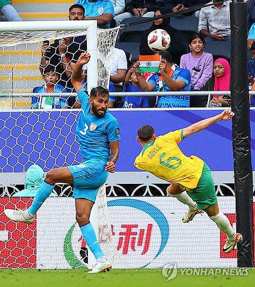 (알라이얀=연합뉴스) 김도훈 기자 = 13일 오후(현지시간) 카타르 알라이얀 아흐마드 빈 알리 스타디움에서 열린 2023 아시안컵 호주와 인도의 경기. 호주 마틴 보일이 발리슛을 시도하고 있다. 2024.1.13