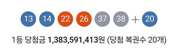 로또당첨번호조회' 1102회 당첨번호 13,14, 22, 26, 37, 38 보너스 번호 20