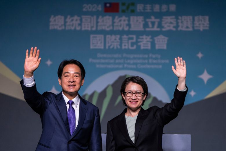 13일 대만 총통 선거에서 승리를 거둔 라이칭더(왼쪽) 총통 당선인과 샤오메이친 부총통 당선인이 타이베이시에서 지지자들에게 손을 흔들고 있다./AP 연합뉴스