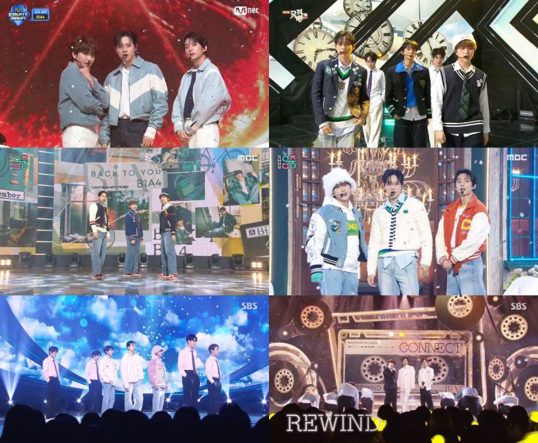 지난 8일 미니 8집 앨범 ‘CONNECT’를 발매한 B1A4가 11일 Mnet ‘엠카운트다운’을 시작으로 12일 KBS2 '뮤직뱅크', 13일 MBC '쇼! 음악중심', 14일 SBS '인기가요'에서 타이틀곡 ‘REWIND’ 무대를 펼쳤다.