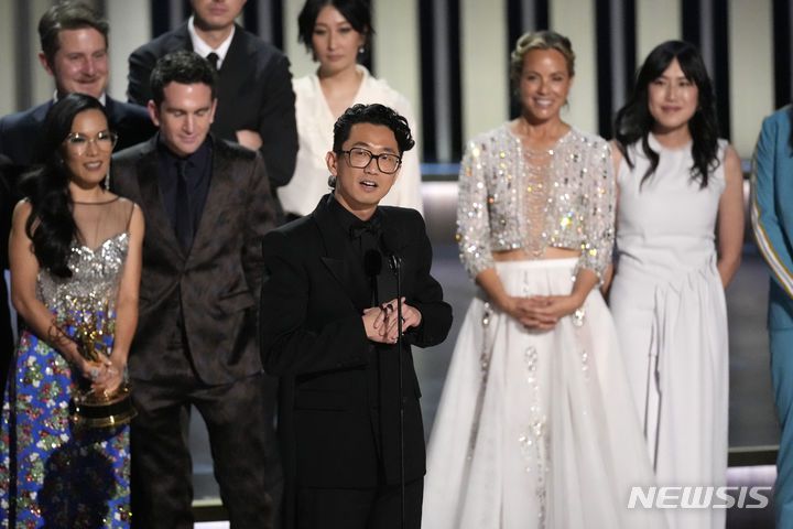 [로스앤젤레스=AP/뉴시스] 이성진(가운데) 감독이 15일(현지시각) 미 캘리포니아주 로스앤젤레스의 피코크 극장에서 열린 제75회 프라임타임 에미상 시상식에서 넷플릭스 드라마 '성난 사람들'(BEEF)로 작품상을 받은 후 출연진과 함께 무대에 올라 소감을 말하고 있다. 2024.01.16. |