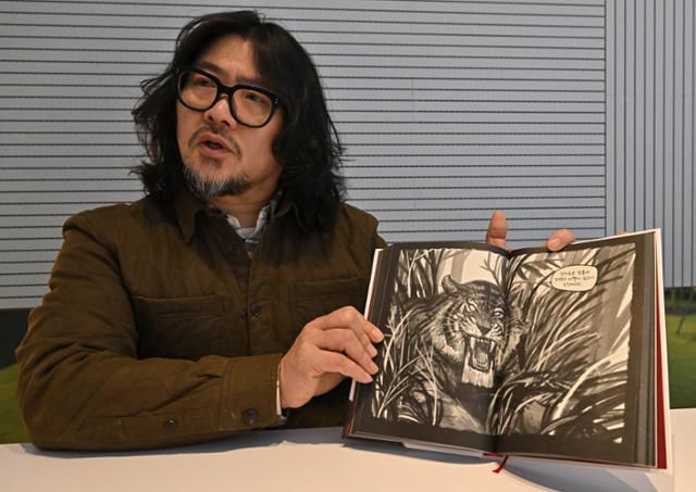 야생동물을 대하는 인간의 잔인함을 다룬 그래픽노블 '적색목록'을 출판한 백영욱 작가가 16일 서울 중구 한국일보 본사에서 인터뷰를 갖고 책에 담긴 드로잉을 소개하고 있다. 정다빈 기자 |