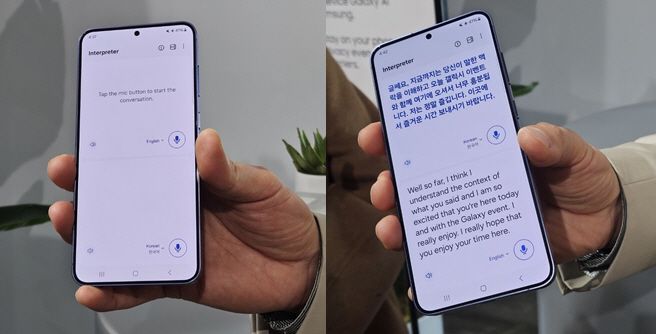 현장에서 갤럭시S24 시리즈로 비행기 모드에서 미국인, 인도인 등과 동시 대면 대화를 시도해봤다. 갤럭시S24의 메인 바를 아래로 내리면 인터프리터(Interpreter)라는 아이콘이 있는데, 이를 누르면 현장에서 동시 통역을 가능하게 해준다. 기능을 키고 한 미국인에게 "어디에 살고 있니"라고 물으니 2~3초 내외로 바로 번역이 이뤄졌다. 상대방은 내게 "저는 서울에서 살고 있지만, 원래 뉴욕에서 왔다. 그래서 인생의 대부분을 살았다. 당신은 어떤가?"라고 영어로 답했고, 갤럭시S24는 이를 듣고 다시 한국어로 번역을 해줬다.