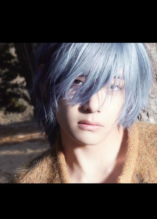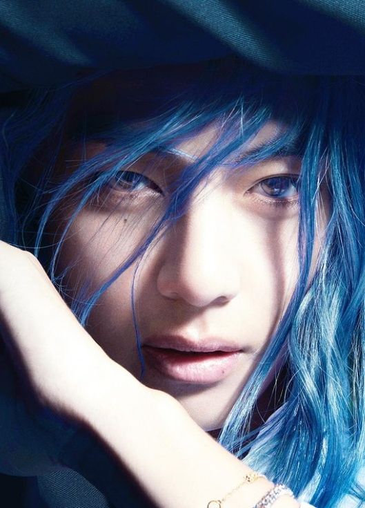 사진에는 푸른빛 머리를 한 뷔의 모습이 담겼다. 화보 속 뷔는 복근을 드러내며 신비로운 분위기를 풍겼다.