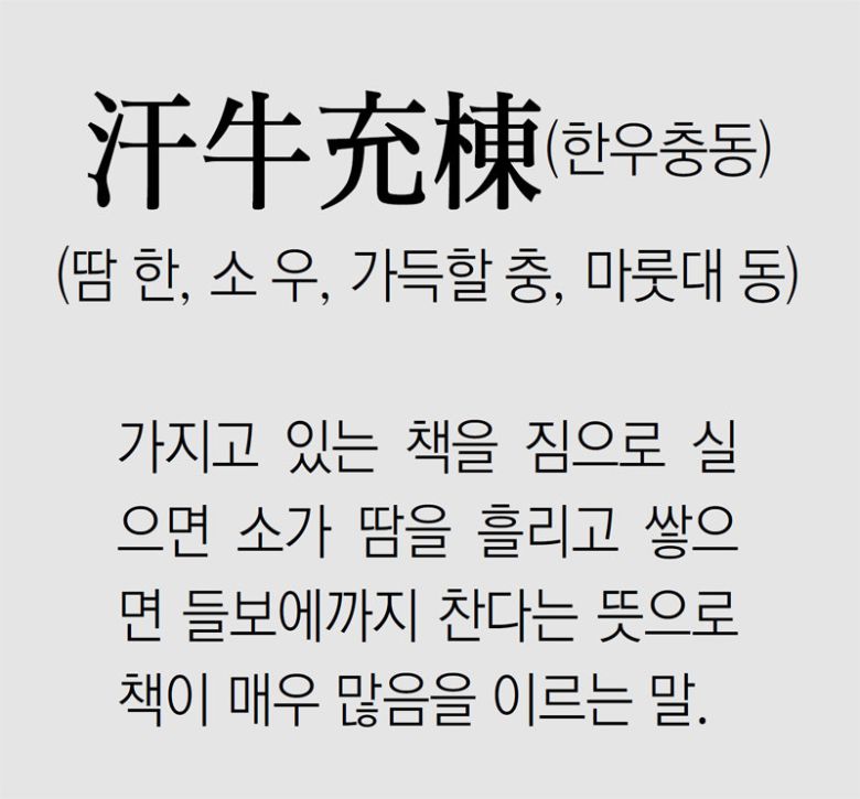 원래 한우충동(汗牛充棟)은 춘추(春秋)의 해석을 두고 올바르지 못한 풀이와 다른 의견을 주장하는 학자들이 많음을 개탄하는 의미에서 나온 표현입니다. 하지만 지금은 책이 매우 많음을 보여주거나 독서를 열심히 해야 한다는 의미의 표현으로 바뀌어 쓰이고 있습니다.