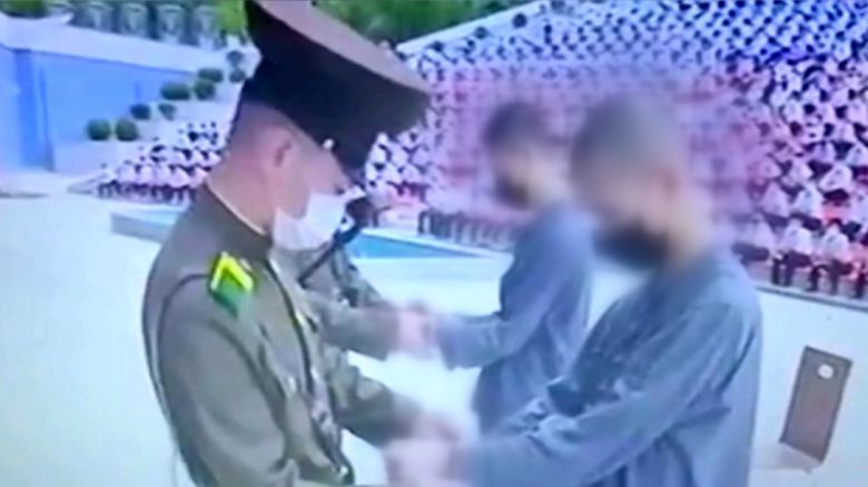 수 백 명의 또래 학생들이 뒤에 앉아 지켜보는 가운데, 교복이 아닌 회색 옷을 입은 채 머리를 박박 밀고 고개를 숙이고 있는 두 학생.