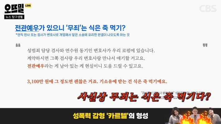 ◆ 조석영> 그걸 법무법인에서 만들어주는 거죠. 역시 CBS 민소운 기자가 취재한 내용인데요. 법무법인 쪽에서 "(가해자가) 명문대생이면 학창시절 생활기록부가 좋았을 거니까 이것도 감형 자료로 제출해라" 얘기를 하는 거죠. 그리고 성범죄 가해자들이 정보를 공유하는 온라인 커뮤니티가 있는데, 거기에 본인이 기소유예, 그러니까 사실상 무죄를 받은 후기가 올라와있어요. 성적 우수상, 대학 성적표, 군대 표창장, 봉사 및 기부 내역은 물론이고 심지어는 가족사진, 인생 일대기 및 인생 계획서를 자료로 제출해서 기소유예를 받았다고 합니다. 가해자 변호사들이 이 모든 걸 싹싹 긁어서 감형 자료를 만드는 거죠. 그리고 가져오라는 수준을 넘어 기획을 해줄 수도 있는데 여기에 카르텔이 개입돼 있다는 지적도 있습니다.