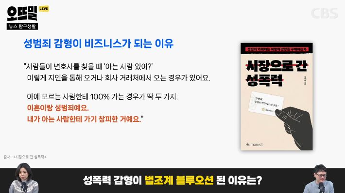 ◆ 조석영> 그래서 마케팅하기 좋은 시장이 됐다는 얘기고, 성범죄 자체가 늘었어요. 10년 사이에 2.8만 건에서 3.2만 건 정도로 늘었으니까 애초에 가해자가 많아졌을 거고, 로스쿨도 도입됐잖아요. 변호사도 늘었죠. 그러니까 새로운 시장이 필요했던 법조계 입장에서는 적극적으로 성범죄 시장을 공략할 유인이 있었겠죠.
