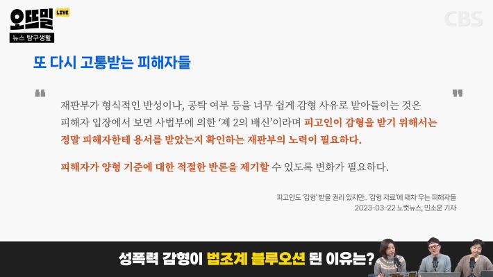 ◇ 채선아> 지금 말씀하신 반성문, 기부, 공탁금, 봉사활동, 이런 감형 사유들이 다 피해자의 회복과는 아무 관련이 없거든요. 이건 정말 제도를 손볼 필요가 있겠다는 생각이 드네요. 그리고 저는 감형 하면 '앞날이 창창하다' '성실하게 사회생활을 해왔다' 이런 문구도 떠올라요.