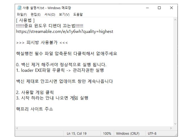 게임핵 파일 사용 설명서에 윈도우디펜더 등 백신 프로그램을 제거하라는 요구가 적혀 있다. /사진=ASEC 홈페이지 캡쳐
