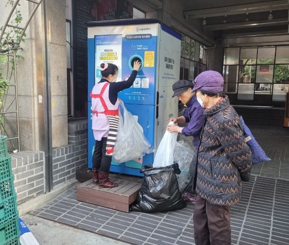 서울 동작구 한 주민센터 앞에 설치된 재활용 페트병 수거함에 한 시민이 투명페트병을 넣고 있다. ⓒ케미컬뉴스 |