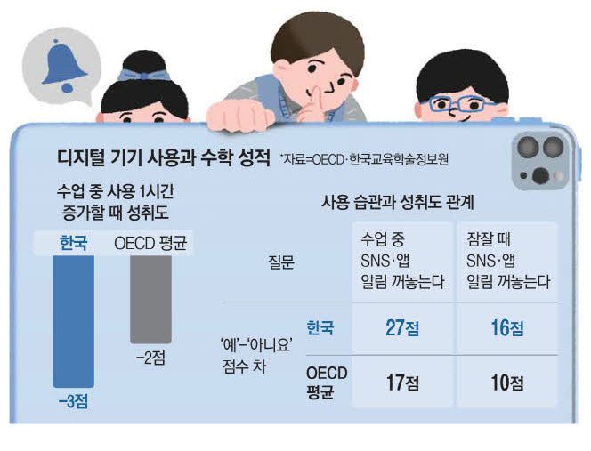 디지털 기기 알림을 켜둘수록 수학 성취도 점수가 낮아지는 경향도 나타났다. 수업 중 디지털 기기의 사회관계망서비스(SNS)·앱 알림을 켜둔다고 답한 학생은 그렇지 않은 학생보다 수학 성취도 점수가 27점 낮았다. OECD 평균은 켜둔다고 답한 학생이 그렇지 않은 학생보다 17점 낮았다. 잠잘 때 알림을 켜두는 학생도 그렇지 않은 학생보다 수학 성취도 점수가 낮았다. 한국은 16점, OECD 평균은 10점이 낮았다.