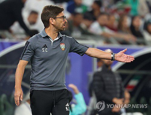 (알라이얀=연합뉴스) 김도훈 기자 = 23일(현지시간) 카타르 알라이얀 에듀케이션 시티 스타디움에서 열린 2023 아시아축구연맹(AFC) 아시안컵 조별리그 C조 최종전 이란과 아랍에미리트 경기. 아랍에미리트 세르지우 코스타 수석코치가 선수들을 독려하고 있다. 2024.1.24