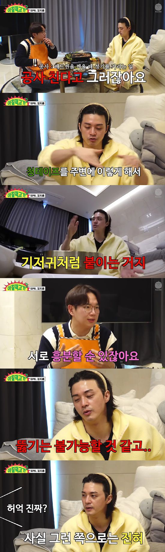 이어 장성규는 "베드신을 찍다보면 서로 흥분할 수 있지 않나. 몸에 신체적 변화가 있을 때 어떻게 하냐. 뚫고 나오냐"고 솔직히 물었고 김지훈은 "물리적으로 뚫는 건 변강쇠가 와도 불가능이다. 난 개인적으로 그걸 찍으며 신경 쓸 게 많아서 그런 쪽으로는 변화가 있을 수 없다"고 더욱 진솔하게 답했다.