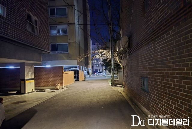 가로등 몇 개만 켜져 있는 어둑한 골목에서 나이토그래피로 촬영했다. 실제보다 훨씬 밝게 촬영됐다. 가로등이 있지만 육안으로는 어둡게 보이는 골목이 나이토그래피로 찍은 사진은 환하고 선명하다.
