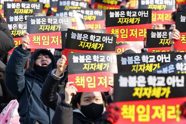 반면 교사 노조들은 늘봄학교 자체를 학교가 아닌 지자체의 업무로 이관해야 한다는 입장이라 일시적으로 기간제 교사를 확충해 업무를 맡기는 방안에도 부정적이다. 전국초등교사노조는 27일 정부서울청사 앞에서 집회를 열고 "늘봄학교는 교육기관인 학교를 돌봄기관으로, 담임교사를 민원담당자로 전락시켜 교육의 본질을 저해하고 있다"고 밝혔다. 집회에 참여한 경북 지역의 한 교사는 "기간제 교사도 교사다. 그래놓고 교사를 늘봄 업무에서 배제하겠다는 건 앞뒤가 맞지 않는다"고 지적했다.