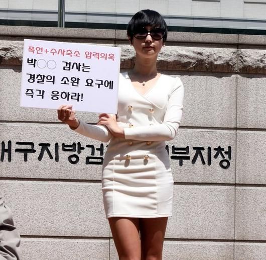 이지은 전 총경이 지난 2012년 경찰청 수사구조개혁단 경감 시절 검사의 경찰 출석을 요구하는 1인 시위를 하고 있다. 당시 이 전 총경은 선글라스에 미니스커트 차림으로 화제를 모았다. |