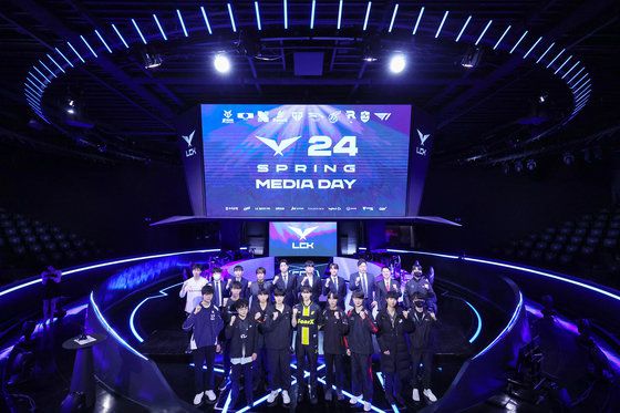 10일 오후 서울 종로구 롤파크 LCK(리그 오브 레전드 챔피언스 코리아) 아레나에서 열린 ‘2024 LCK 스프링 개막 미디어데이’에서 e스포츠 구단 선수들과 감독들이 기념촬영을 하며 파이팅을 외치고 있다. 2024.1.10/뉴스1