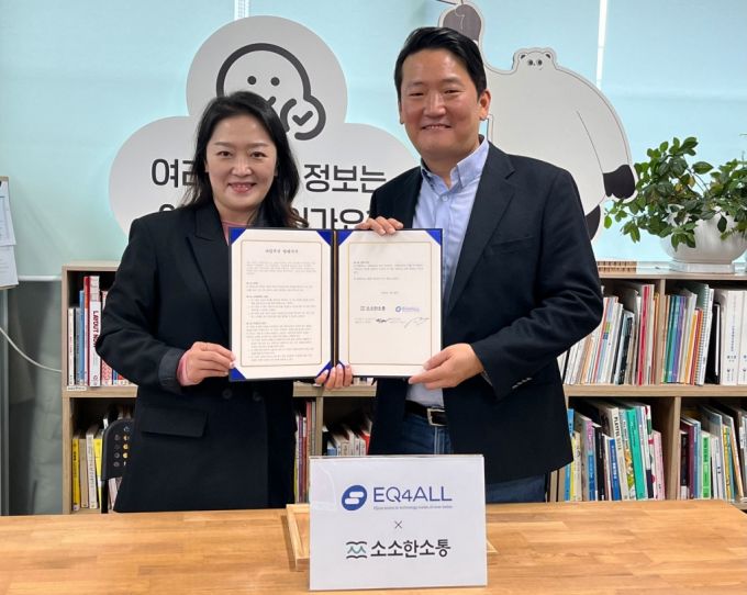 이큐포올은 소소한소통과 업무협약을 체결하고 장애인의 정보 접근성을 증진하기 위해 다양한 분야에서 협업을 추진하기로 했다. 소소한소통에서 열린 협약식에서 소소한소통 백정연 대표(왼쪽부터 첫 번째)와 이큐포올 이인구 대표(왼쪽부터 두 번째)가 기념 촬영을 하고 있다./사진제공=이큐포올 |