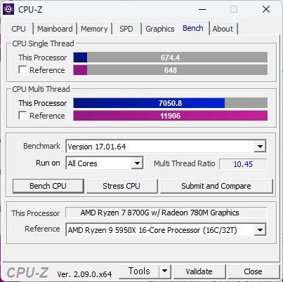 같은 아키텍처를 사용했기 때문에 CPU로서의 성능은 전반적으로 라이젠 7000 시리즈, 그 중에서도 라이젠 7700과 비슷하다. 프로세서 구성은 8코어 16스레드, 베이스클럭 4.2GHz 부스트클럭 5.1GHz, 캐시메모리 24MB, TDP는 65W이며 여기에 라데온 780M 내장그래픽이 탑재되었다.