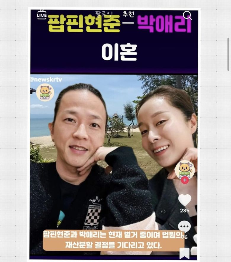 공개된 사진에는 팝핀현준과 박애리에 관한 가짜뉴스 캡처가 담겨있다. 가짜뉴스에는 "팝핀현준과 박애리는 현재 별거 중이며 법원의 재산분할 결정을 기다리고 있다"라고 쓰여 있다.