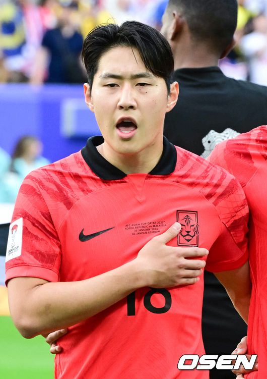 [OSEN=알 와크라(카타르), 지형준 기자] 25일(현지시간) 오후 카타르 알 와크라에 위치한 알 자누브 스타디움에서 2023 아시아축구연맹(AFC) 아시안컵 E조 조별리그 최종전 대한민국과 말레이시아의 경기가 열렸다.경기 앞서 이강인이 국민의례를 하고 있다.  2024.01.25 / jpnews.osen.co.kr