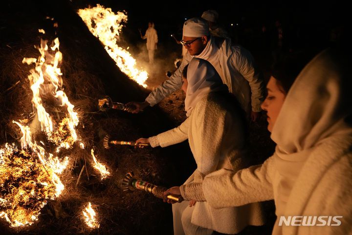 모닥불에 불 붙이는 이란 조로아스터교 청년들
