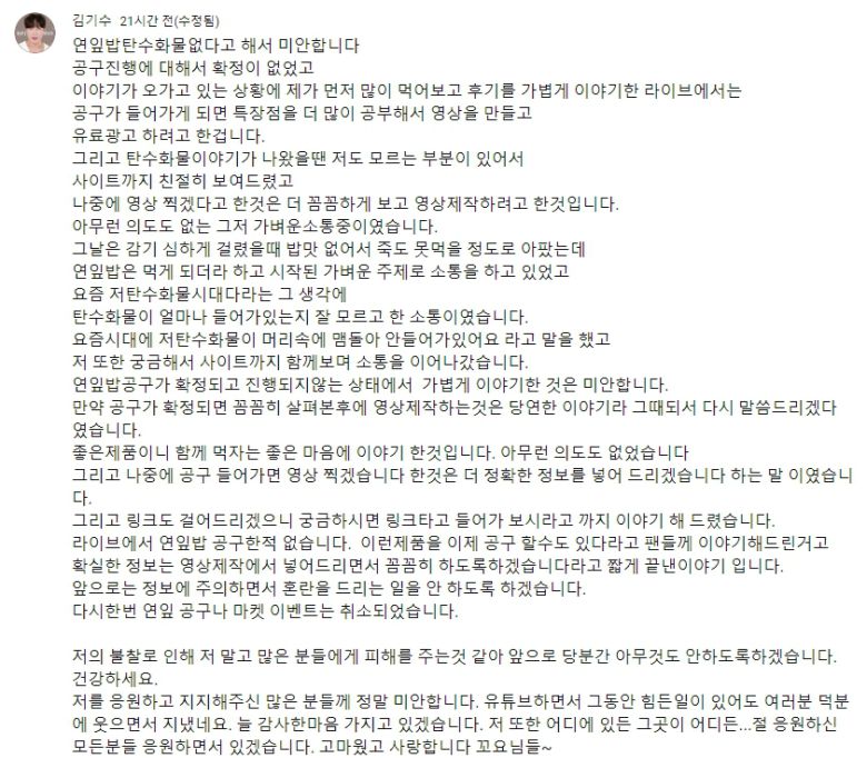그는 "탄수화물 이야기가 나왔을땐 저도 모르는 부분이 있어서 사이트까지 친절히 보여드렸고, 나중에 영상 찍겠다고 한 것은 더 꼼꼼하게 보고 영상 제작하려고 한 것"이라며 "요즘 '저탄수화물 시대다'라는 그 생각에 탄수화물이 얼마나 들어가있는지 잘 모르고 한 소통이었다. 연잎밥 공구가 확정되고 진행되지 않는 상태에서 가볍게 이야기한 것은 미안하다. 앞으로는 정보에 주의하면서 혼란을 드리는 일을 안 하도록 하겠다"고 전했다.