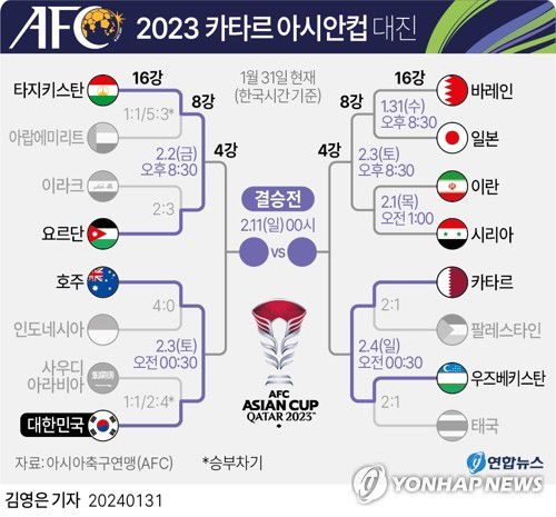 일본과 이란이 맞붙는 대진표 반대편에서도 결승전급 대진이 만들어졌다. 클린스만호와 아시아의 유럽 호주가 만난다.