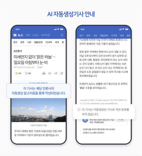 ② AI 작성 기사 표시: 네이버는 또 1일부터 언론사가 AI로 생성하거나 전송한 기사의 본문 상단과 하단에 ‘이 기사는 해당 언론사의 자동 생성 알고리즘을 통해 작성되었습니다’라는 문구를 표시한다. 생성 AI를 활용한 뉴스 제작이 늘어나면서 AI와 로봇이 자동으로 작성한 기사를 구분해 이용자 혼란을 방지하려는 조치다. 네이버는 “선거 관련 허위 정보 확산을 막기 위해 다양한 기술적·정책적 노력을 다하겠다”고 강조했다.