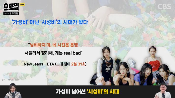 ◆ 조석영> 작년에 차트를 휩쓸었던 뉴진스의 ETA, 2분 31초예요. 심지어 이 노래 가사 첫 줄이 "낭비하지 마. 네 시간은 은행"이에요. 정말 길이부터 가사까지 시대정신을 담고 있는 노래였던 거죠.