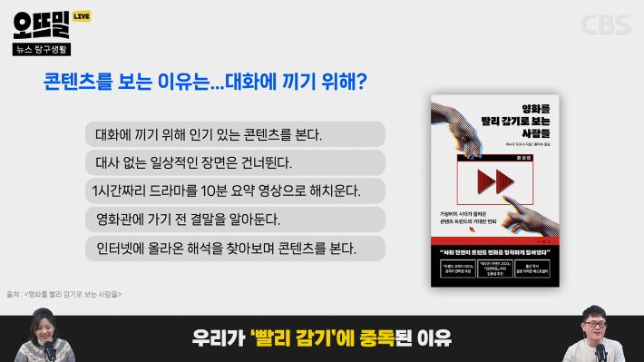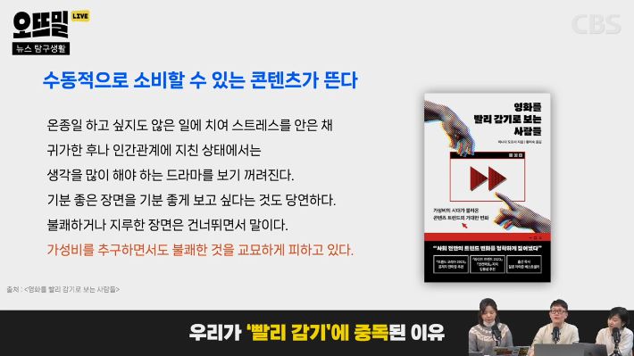 ◆ 조석영> 여기에 역설적인 문제가 있어요. 빨리 감기를 통해서 수동적으로 콘텐츠를 소비하면 뇌를 덜 쓰게 되는 게 아니냐 싶은데, 오히려 빨리 감기 시청의 부작용은 뇌에 과부하가 걸리는 문제라는 지적이 있습니다. 2배속으로 보면 같은 시간에 정보량이 2배가 되잖아요. <생각하지 않는 사람들>이라는 책과 <2024 트렌드 모니터>에 나오는 분석인데요.
