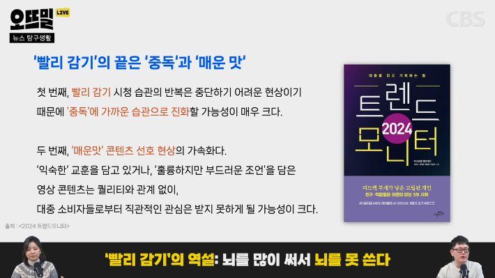 ◆ 조석영> 그러면 어떻게 되느냐. 새로운 걸 받아들일 여유는 없으니까 또 같은 맛, 비슷한 콘텐츠를 찾게 된다는 겁니다. 그래서 <2024 트렌드 모니터>에서는 이 현상을 '빨리 감기 중독'이라고 설명하더라고요. 보면 볼수록 점점 같은 것만 찾게 되는 방식으로 중독이 되고, 심지어 점점 자극이 강한, 일명 '매운맛' 콘텐츠를 선호하게 된다는 점을 경고하고 있습니다.