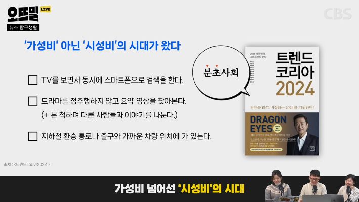 TV를 보면서 동시에 스마트폰으로 검색을 한다거나, 16부작 드라마를 정주행하지 않고 유튜브에 요약 영상을 찾아본다거나, 지하철을 탈 때 환승 통로나 출구와 가까운 차량 위치에 미리 가있는다거나 하는 식으로 시간을 아끼는 거죠. <트렌드 코리아 2024>에서 '분초사회'라는 주제로 분석한 트렌드인데요. 시간 소비와 계획 단위가 분초로 나눠진다는 거예요. 그러다보니 이 책에선 "이제 시간 지상주의를 떠받드는 시대가 왔다"라고 분석을 하고 있습니다.