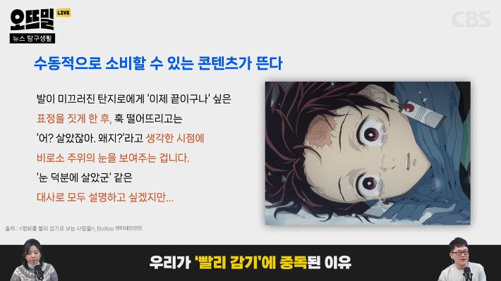 ◆ 조석영> 요즘 콘텐츠에 계속 설명이 많아지는 게 이 빨리 감기 시청 습관이랑도 맞닿아 있다는 겁니다. 쉽게 말하면 더 적극적으로 작품에 몰입하거나 해석할 필요 없이 수동적으로 소비할 수 있게 되는 거죠.
