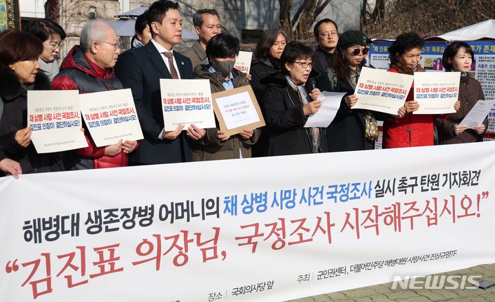 [서울=뉴시스] 추상철 기자 = 군인권센터와 더불어민주당 해병대원 사망사건 진상규명TF가 31일 오전 서울 여의도 국회 앞에서 '해병대 생존장병 어머니의 채 상병 사망사건 국정조사 실시 촉구 탄원' 기자회견을 하고 있다. 2024.01.31. scchoo@newsis.com |