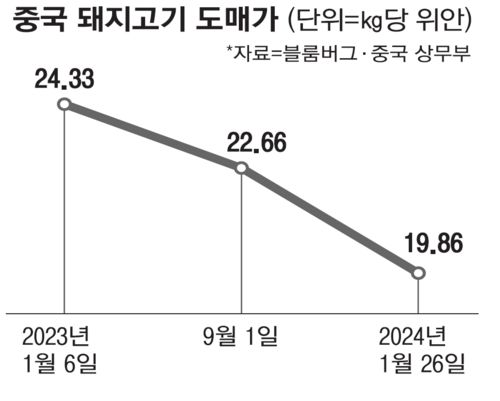 컨설팅회사 상하이 JCI에 따르면 작년 중국의 돼지고기 소비는 약 5400만t으로 전년 대비 100만t 가량 줄었다. 3년 만의 리오프닝(경제활동 재개)으로 외식 등 외부활동이 늘었음에도 돼지고기 소비가 오히려 줄어든 셈이다. 수요가 줄면서 가격도 급락했다. 작년 12월 중국 돼지고기 가격은 전년 동월 대비 무려 26.1% 하락했다.