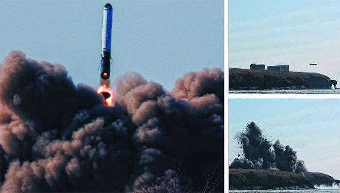 북한이 지난 2일 서해상에서 순항미사일의 ‘초대형 전투부’ 위력 시험과 신형 지대공미사일 시험 발사를 진행했다고 3일 조선중앙통신이 밝혔다. 순항미사일이 높은 각도로 발사(왼쪽)된 뒤, 육지를 향해 낮게 날아가(오른쪽 위), 목표 건물을 타격해 폭발했다(오른쪽 아래). /조선중앙통신 연합뉴스 |