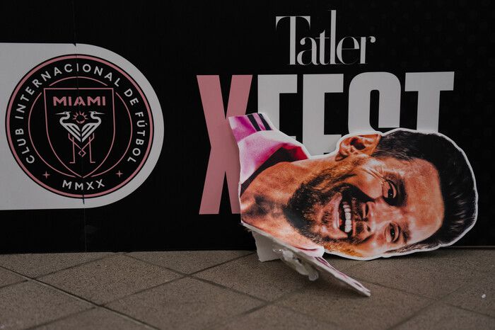 미국 프로축구 인터 마이애미의 리오넬 메시가 4일(현지시각) 홍콩에서 열린 홍콩 올스타 팀과의 친선 경기에 나서지 않으면서, 분노한 팬이 걷어찬 홍보용 대형 입간판에서 떨어져 나온 메시의 얼굴이 바닥을 뒹굴고 있다. 홍콩/AP 연합뉴스 |