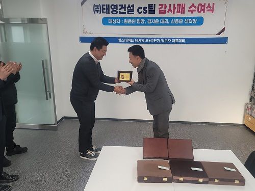 입주자대표회의의 박재열 회장은 “태영건설 CS팀 직원들이 입주 초기 발생한 하자 보수 민원을 해결하고자 직접 상주하면서 입주민의 불편 사항을 듣고 신속하게 처리해 준 결과, 입주 3년 차에 접어든 현재 입주민의 만족도가 상당히 높다”라며 “이에 대한 감사의 뜻으로 감사패를 전달한다”라고 밝혔다.