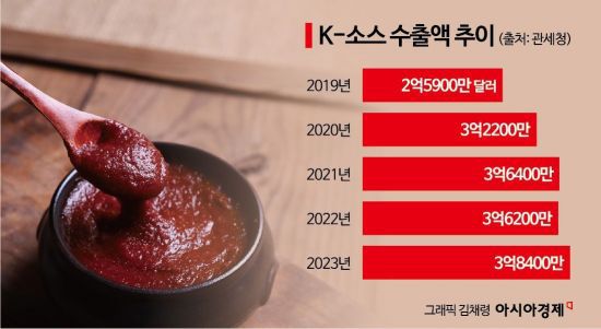 7일 관세청에 따르면 지난해 양념소스·전통장류 등 수출액이 3억8400만달러(약 5120억원)를 기록했다. 연간 기준 역대 최대 금액으로 전년 3억6200만달러 대비 6.2% 증가했다. 수출 물량은 13만1800t이었다. 2021년 13만2000t에 이어 두 번째로 많았다. 10년 전인 2013년 6만6000t과 비교하면 약 2배로 늘어난 규모다.