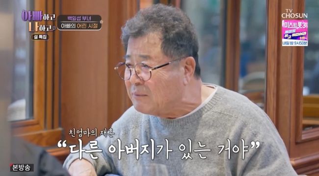 7일 오후 방송된 TV CHOSUN '아빠하고 나하고’에서는 딸과 사위와 레스토랑에서 함께 식사를 하는 백일섭의 모습이 그려졌다.