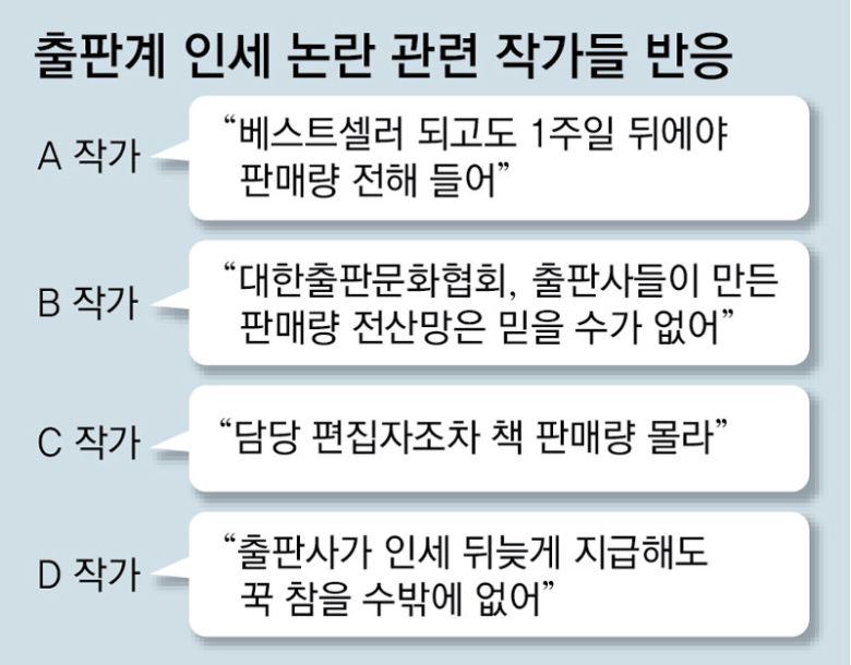 하지만 작가들은 여전히 “바뀐 게 없다”는 반응이다. 책마다 고유 번호가 없어 출판사가 판매부수를 얼마든지 속일 수 있다는 것. 한 작가는 “담당 편집자조차 책이 얼마나 팔렸는지 모를 정도로 출판사 내부에서도 판매량을 쉬쉬한다”며 “하물며 작가가 정확한 판매량을 어떻게 알 수 있겠느냐”고 되물었다.