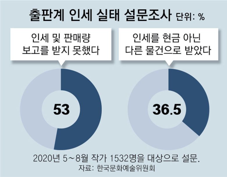 판매량 집계가 실시간으로 이뤄지지 않는 것도 문제다. 인쇄부수가 아닌 판매부수를 기준으로 인세를 정산하는데, 반품된 물량을 반영하다 보니 인쇄 후 길게는 수개월이 지나서야 판매량을 알 수 있다는 것. 다른 작가는 “출판사가 인세를 뒤늦게 지급한 걸 나중에 알았지만 문제를 제기하지 못했다. 인세를 언급하는 작가를 속물로 보는 시선을 의식하지 않을 수 없었다”고 했다.