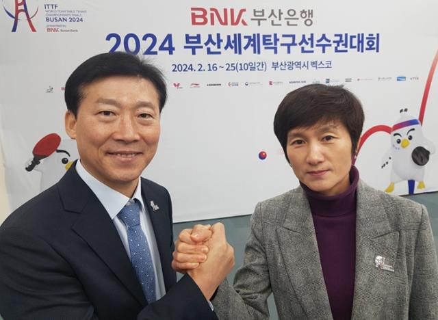 부산세계탁구선수권대회 조직위원회 김택수 사무총장(왼쪽)과 현정화 집행위원장은 한국 최초 세계탁구선수권을 최고 대회로 만들겠다고 다짐하며 두 손을 맞잡았다. 부산=권경훈 기자 |