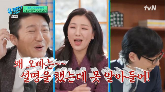 14년차 이혼변호사 박은주가 등장해 이혼과 관련된 이야기를 나눴다. 박은주 변호사는 “컵하고 정리 정돈 잘하시나요?”라고 질문했고 유재석은 “저는 하죠”라고 답했다. 이를 들은 박은주 변호사는 “아 너무 1등 신랑감. 그죠옹?”라고 말해 웃음을 안겼다.