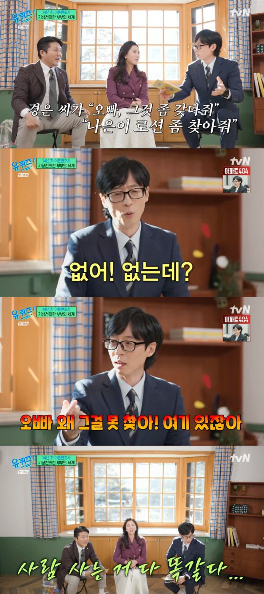 유재석은 “제가 자주 듣는 얘기다. 경은 씨가 ‘오빠 그것 좀 갖다줘’ ‘나은이 로션 좀 찾아줘’ 없다. ‘오빠 왜 그걸 못 찾아? 여기 있잖아’”라고 설명해 눈길을 끌었다.