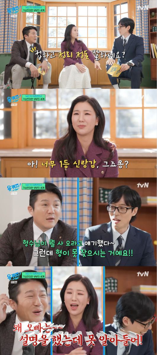 유재석은 “저는 다른 걸로 얘기를 들은 적이 있다”라고 말했다. 이어 조세호는 유재석과 운동을 끝낸 후 이동을 하다가 형수님이 사온 물건을 사러간 적이 있다고 밝혔다. 유재석이 길을 찾지 못해 형수님에게 전화를 걸자 ‘왜 오빠는 설명을 했는데 못 알아들어!’라고 말했다고 해서 웃음을 자아냈다.