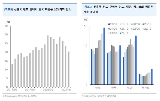 이어 “한국은 2023년 하반기에 신흥국 주식펀드 안에서 투자 비중이 늘어나, 2023년말 10%를 기록했다”면서 “신흥국 경제 환경이 변화하면서, 중국의 자리를 대체하는 신흥국 선호 현상은 이어질 것”이라고 예상했다.