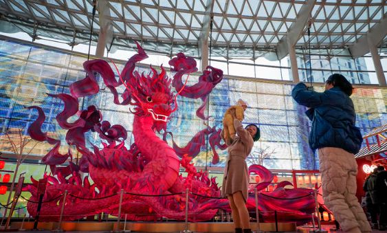 청룡의 해인 갑진년(甲辰年)을 맞아 중국에서는 용의 공식 영문 표기를 'dragon'(드래곤)에서 'loong'(룽)으로 바꿔야 한다는 목소리가 높아지고 있다. 사진은 지난 4일 중국 베이징의 한 쇼핑몰을 찾은 방문객들이 설날을 앞두고 전시된 용과 장신구 앞에서 기념사진을 찍는 모습. [사진=뉴시스] |